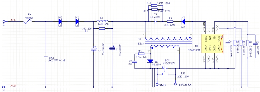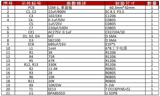 在電源管理設計領域,BPA8505D是一款備受推崇的芯片,它以其卓越的性能和靈活性,為工程師提供了一個全面的參考設計。本文將全面介紹BPA8505D的參考設計,包括簡介、電路圖、物料清單(BOM)、PCB布局圖、電路實物圖以及變壓器規格書,為讀者提供一個從設計到實現的完整視角。