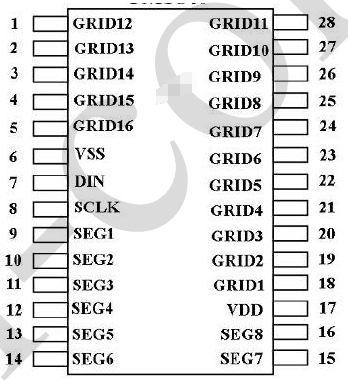 GRID1-GRID16:位輸出,N管開(kāi)漏輸出,用于控制LED的各個(gè)段。