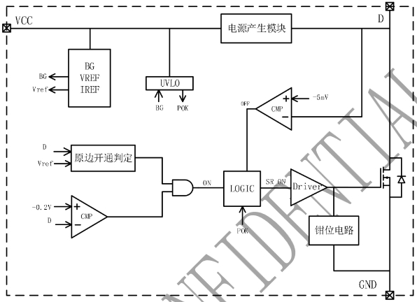 VCC供電:芯片內部集成了VCC供電技術,能夠在不需要輔助繞組供電的情況下,保證VCC電壓穩定.當系統上電后,通過內置MOS的體二極管對輸出電容充電,當VCC電壓達到開啟閾值時,芯片內部控制電路開始工作。