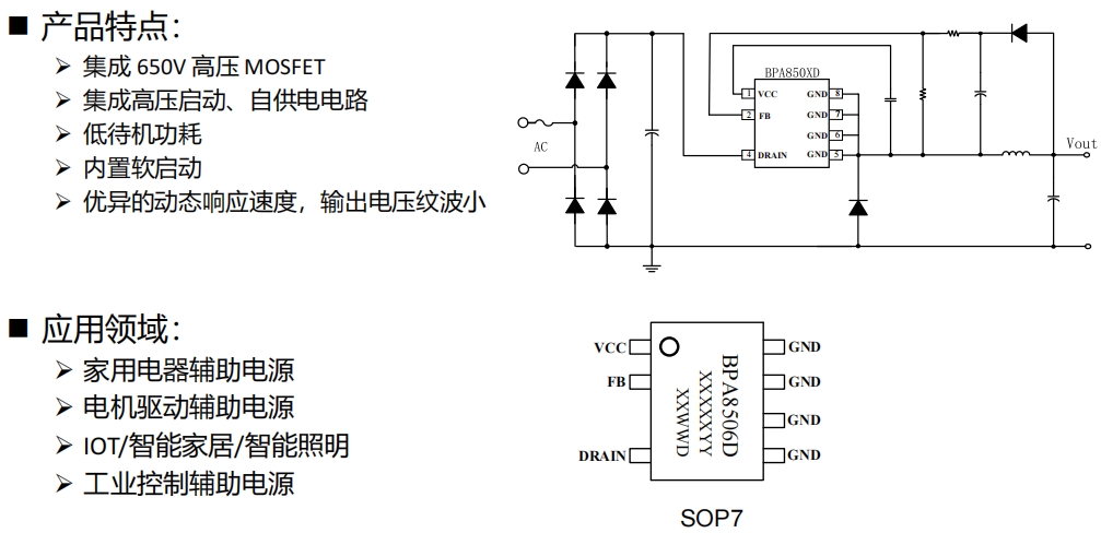 BPA8506D是一款集成了650V高壓MOSFET的高性能電源管理芯片,專為滿足家用電器、電機驅動、物聯網設備以及工業控制等領域的輔助電源需求而設計。它不僅具備高壓啟動和自供電功能,還實現了低待機功耗、優異的動態響應速度以及低輸出電壓紋波等特性,極大地提升了電源系統的整體性能。