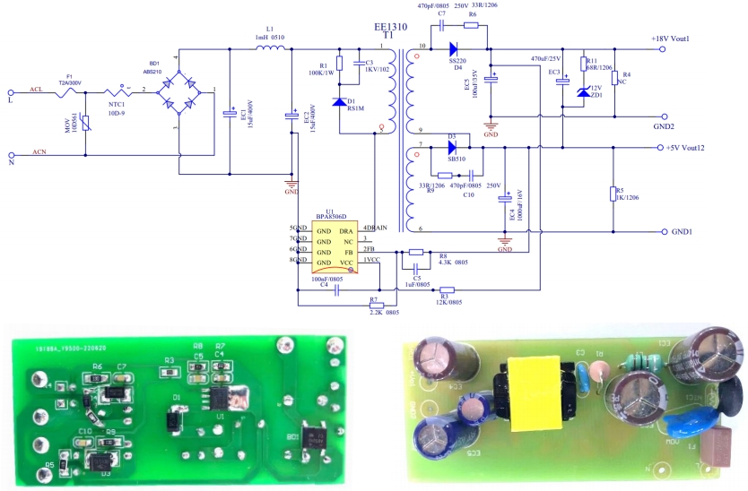 BPA8506D參考設計的電路圖和實物圖展示了其簡潔而高效的布局。通過合理選擇元件和優化電路結構,該設計實現了高性能與高可靠性的平衡。例如,采用EE1310磁芯的變壓器,其初級繞組感量為950uH±7%,漏感量小于30uH,確保了高效的能量傳輸和穩定的輸出電壓。此外,電路中還配備了多種保護機制,如短路保護、過流保護等,進一步提升了系統的安全性。