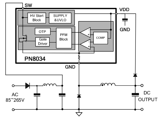 PN8034內置高壓啟動模塊,能夠實現系統快速啟動和超低待機功耗,待機功耗低于100mW。