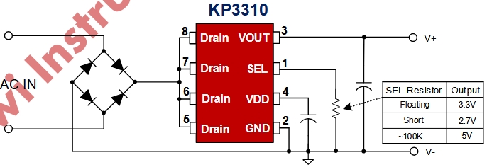 該芯片支持多種輸出電壓選項(xiàng),包括5V、3.3V和2.7V,通過SEL引腳進(jìn)行編程選擇。這種靈活性使得KP3310SGA能夠適應(yīng)多種應(yīng)用場(chǎng)景,滿足不同設(shè)備對(duì)電源電壓的需求。