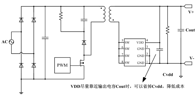 PL3331 的典型應(yīng)用電路圖展示了其在反激式開關(guān)電源中的簡潔而高效的連接方式。在圖中,輸入電壓(V+)通過變壓器連接到 PL3331 的 SW 管腳,而輸出電壓則通過電容(Cout)進(jìn)行濾波。為了確保系統(tǒng)的穩(wěn)定運(yùn)行,PL3331 的 VDD 管腳需要連接到一個穩(wěn)定的電源,通常是從輸出電壓中獲取。此外,為了降低成本,當(dāng) Cvdd 盡量靠近輸出電容 Cout 時,可以省略 Cvdd。