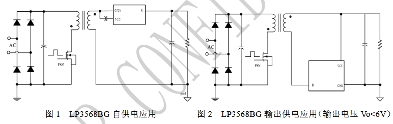 在自供電應用中,LP3568BG通過其D腳連接輸出電壓,利用內置MOS的體二極管對輸出電容充電,實現自供電啟動。當VCC電壓達到開啟閾值時,芯片內部控制電路開始工作,MOS管正常導通和關斷,電流從MOS管的溝道流過,而非體二極管,從而實現高效的同步整流。這種應用方式適用于需要簡化電路設計、減少外部電源依賴的場景。