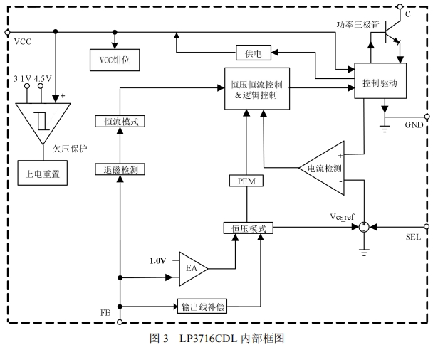 該框圖展示了芯片的主要功能模塊,包括功率三極管、VCC供電電路、恒壓恒流控制電路、保護(hù)功能電路等。通過這些模塊的協(xié)同工作,LP3716CDL能夠?qū)崿F(xiàn)高效的電源管理和精確的輸出控制。