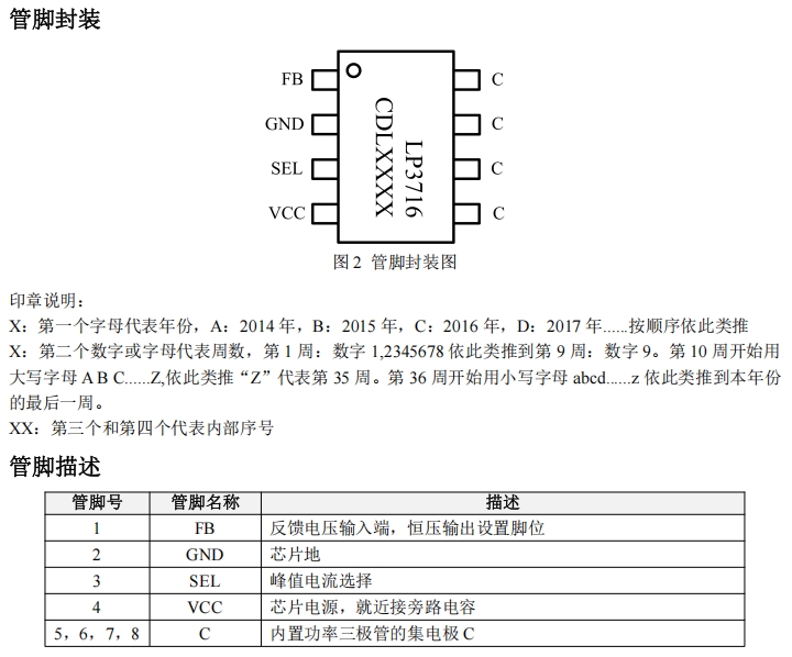 LP3716CDL集成了多種保護(hù)功能,包括VCC鉗位/欠壓保護(hù)、FB腳上電阻開路保護(hù)、輸出短路保護(hù)、輸出過壓保護(hù)、輸出續(xù)流管開路保護(hù)以及過溫保護(hù)等,確保電源系統(tǒng)在各種異常情況下都能安全運(yùn)行。
