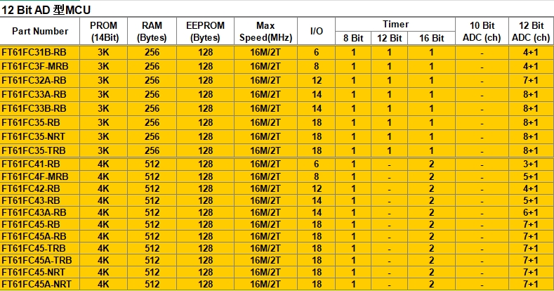 | Flash | 3 KW (FT61F131B) | 12 KW (FT61FCC7C) | 3/4/6/8/10/12 K 階梯式覆蓋 |