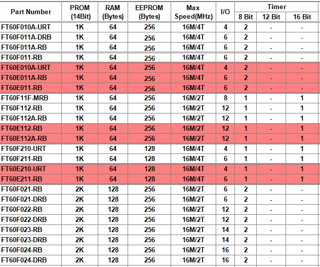 | FT60F010A | 1K Flash/64RAM/256EE | 16MHz | 無 | 無 | 超小SOT23-6封裝 |