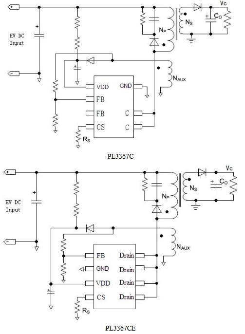 PL3367CE同時具有多種保護功能:逐周期峰值電流檢測、VDD 欠壓/過壓保護、輸出過壓保護、輸出短路保護和過溫保護等。