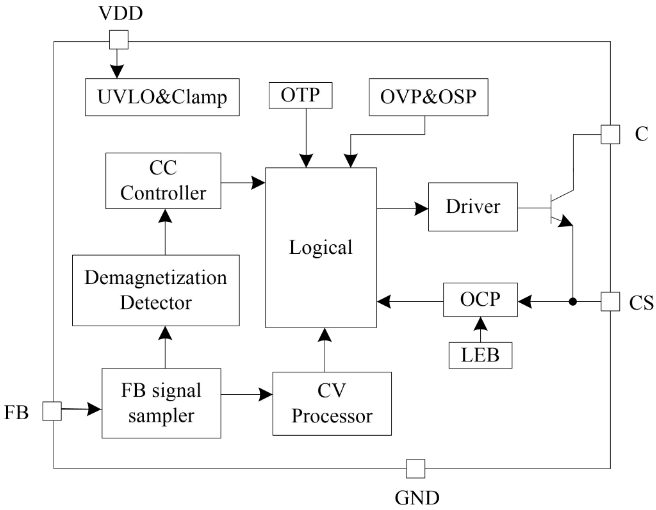 PL3367CE是一系列原邊控制,用于反激式開關電源的恒流/恒壓調節器。其高度集成了功率開關,并通過去除光耦以及次級控制電路,在簡化充電器/適配器等傳統的恒流/恒壓設計的同時實現了精確的電流和電壓調節,內部框架圖如下圖所示。