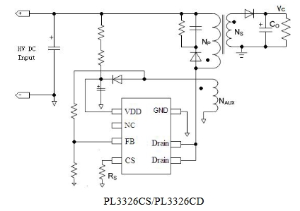 復(fù)合模式的應(yīng)用使得芯片能夠?qū)崿F(xiàn)低靜態(tài)功耗、低音頻噪音、高效率。而且高集成的功率 MOSFET 能夠降低外部 PCB的面積以及系統(tǒng)的成本。PL3326C 同時具有多種保護(hù)功能:逐周期峰值電流檢測、欠壓保護(hù)、過壓保護(hù)等。