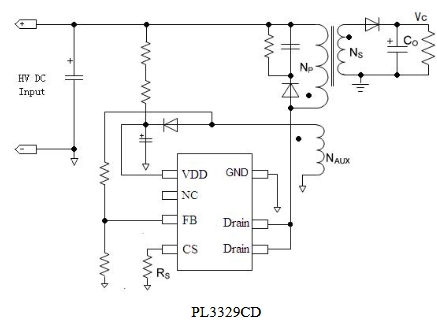 復(fù)合模式的應(yīng)用使得芯片能夠?qū)崿F(xiàn)低靜態(tài)功耗、低音頻噪音、高效率。而且高集成的功率 MOSFET 能夠降低外部 PCB的面積以及系統(tǒng)的成本。PL3329C 同時(shí)具有多種保護(hù)功能:逐周期峰值電流檢測(cè)、欠壓保護(hù)、過(guò)壓保護(hù)等。