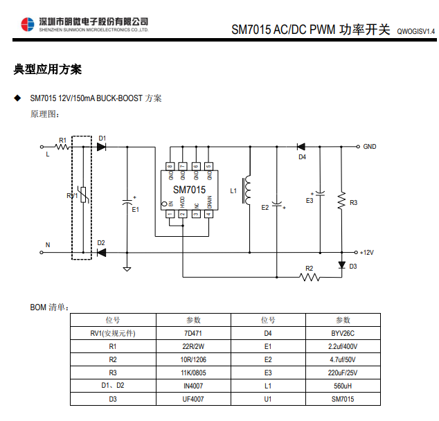 SM7015 是采用電流模式 PWM 控制方式的功率開關(guān)芯片,集成高壓?jiǎn)?dòng)電路和高壓功率管,為低成本開關(guān)電源系統(tǒng)提供高性價(jià)比的解決方案。芯片應(yīng)用于 BUCK 系統(tǒng)方案,支持 12V/18V 輸出電壓,很方便的應(yīng)用于小家電產(chǎn)品領(lǐng)域。并提供了過溫、過流、過壓、欠壓等完善的保護(hù)功能,保證了系統(tǒng)的可靠性。