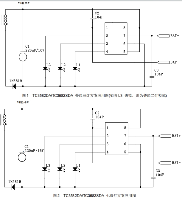 TC3582DA/TC3582SDA的應用電路設計簡潔,主要包括電源、電池、指示燈和限流電阻等部分。以下是兩種典型應用電路: